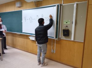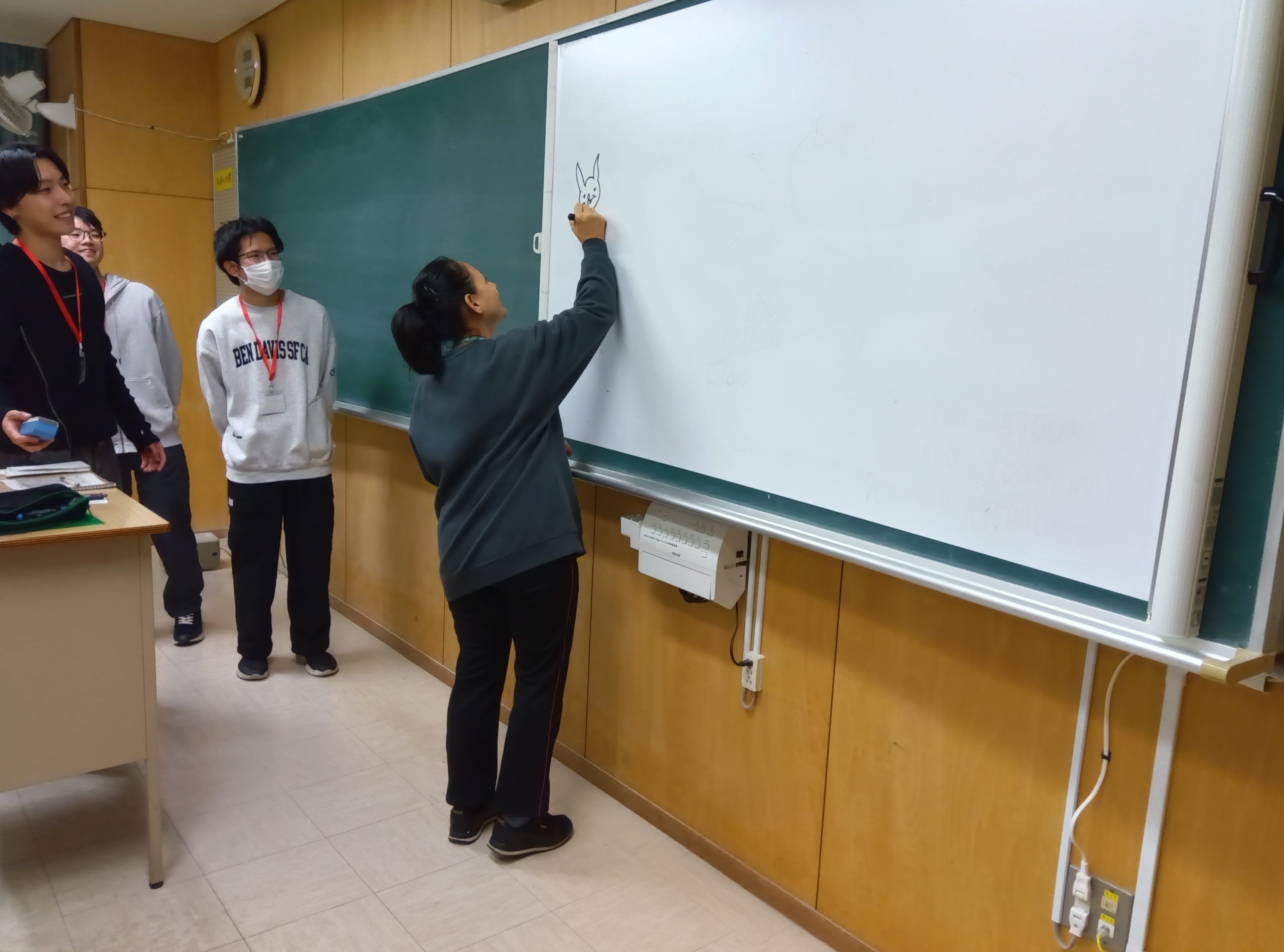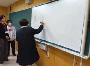 ゆーだいもにあ たいむの じかんに、にちだい こくさい かんけいがくぶの ぼらんてぃあの がくせいさんたちが、「え しりとり」を けいかくして くれました。「うさぎ」から はじまって、「き」「きりまんじゃろ」「ろうそく」「くるま」「まくら」「らくだ」「だんご」と、それぞれ じょうずに えを かいて、つなげて いきました。みんな たのしく さんか できました。ありがとう ございました。
