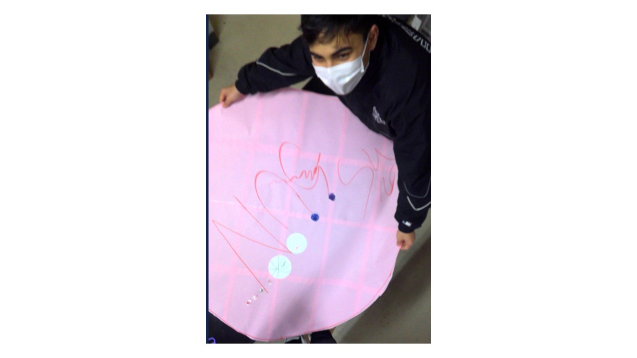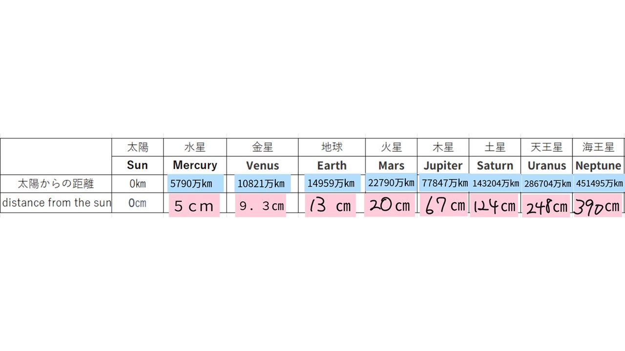 りかの じかんに たいようけいを つくりました。まずは、ちきゅうの ちょっけいを 1cmに して、たいようや すいせいや きんせいなどの ちょっけいを けいさんしました。すると、たいようは もっとも おおきくて 109cmで、すいせいは もっとも ちいさくて 0.4cmでした。つぎに、かみを つかって たいようと 8つの わくせいを つくりました。おおきさの さに おどろきました。つぎに、たいようから すいせいまでの きょりを 5cmにして、ほかの わくせいまでの きょりを けいさんし、ぜんぶの わくせいを ならべました。すると、かせいまでの わくせいは たいように ちかく、ほかの わくせいは ずいぶん とおくに なりました。いちばん そとがわの かいおうせいは 4mぐらい さきに なりました。