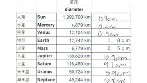 理科の時間に太陽系を作りました。まずは、地球の直径を1cmにして、太陽や水星や金星などの直径を計算しました。すると、太陽は最も大きくて109cmで、水星は最も小さくて0.4cmでした。次に、紙を使って太陽と8つの惑星を作りました。大きさの差に驚きました。次に、太陽から水星までの距離を5cmにして、他の惑星までの距離を計算し、全部の惑星を並べました。すると、火星までの惑星は太陽に近く、他の惑星はずいぶん遠くになりました。一番外側の海王星は4mぐらい先になりました。