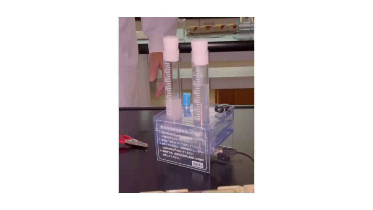りかで しずおかし しみずくに できた すいそすてーしょんを まねて すいそを つくりました。にゅーすに よると、ここでは たいようこうはつでんの でんきを りようして みずを ぶんかいし、すいそを せいさんすると いうことでした。そこで みずに すいさんかなとりうむを まぜ、かんでんちで でんりゅうを ながして すいそを つくりました。らいたーで ひをつけて、すいそで あることを たしかめました。