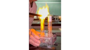 理科で、静岡市清水区にできた水素ステーションをまねて、水素を作りました。ニュースによると、ここでは太陽光発電の電気を利用して水を分解し、水素を生産するということでした。そこで、水に水酸化ナトリウムを混ぜ、乾電池で電流を流して水素を作りました。ライターで火をつけて、水素であることを確かめました。