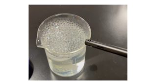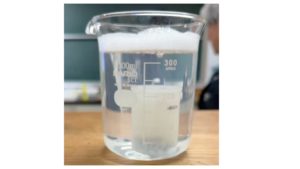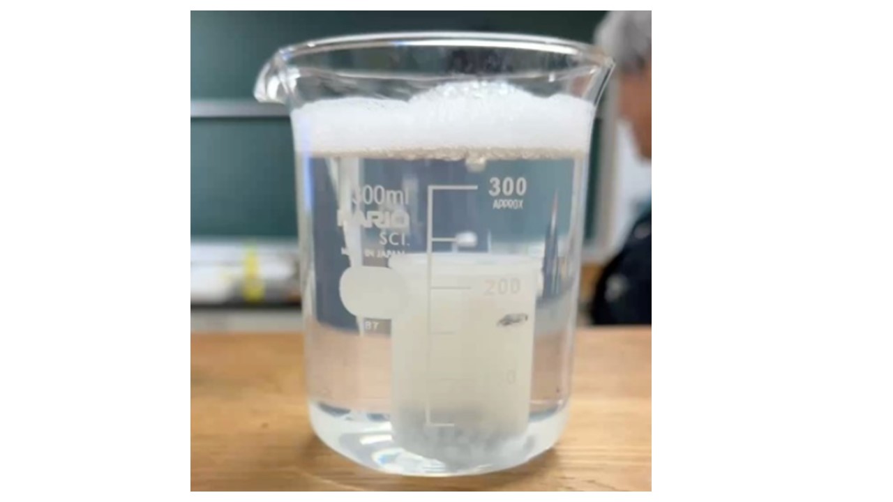 理科の授業で酢から水素を取り出しました。酢は酢酸で化学式はCH3COOHです。液体には水素イオンが入っています。これに金属を入れると水素イオンに電子が結びついて水素が発生します。今回はマグネシウムを入れ、さらに身近な器具としてフィルムケースを使いました。酢とマグネシウムが入ったフィルムケースを洗剤が混ざったビーカーに入れると、水面に水素が入った泡が出てきます。これにライターの火を近づけると炎が上がりました。