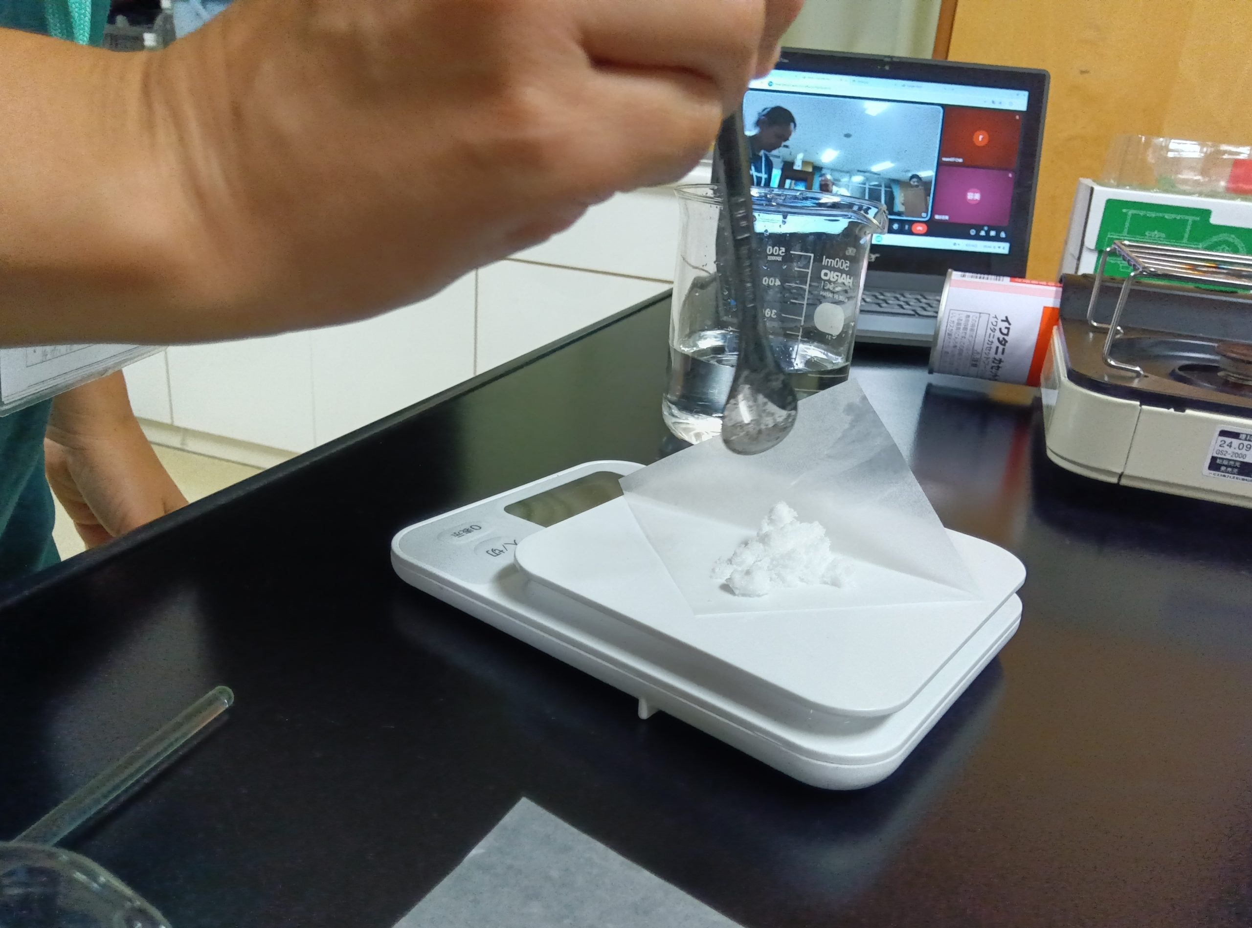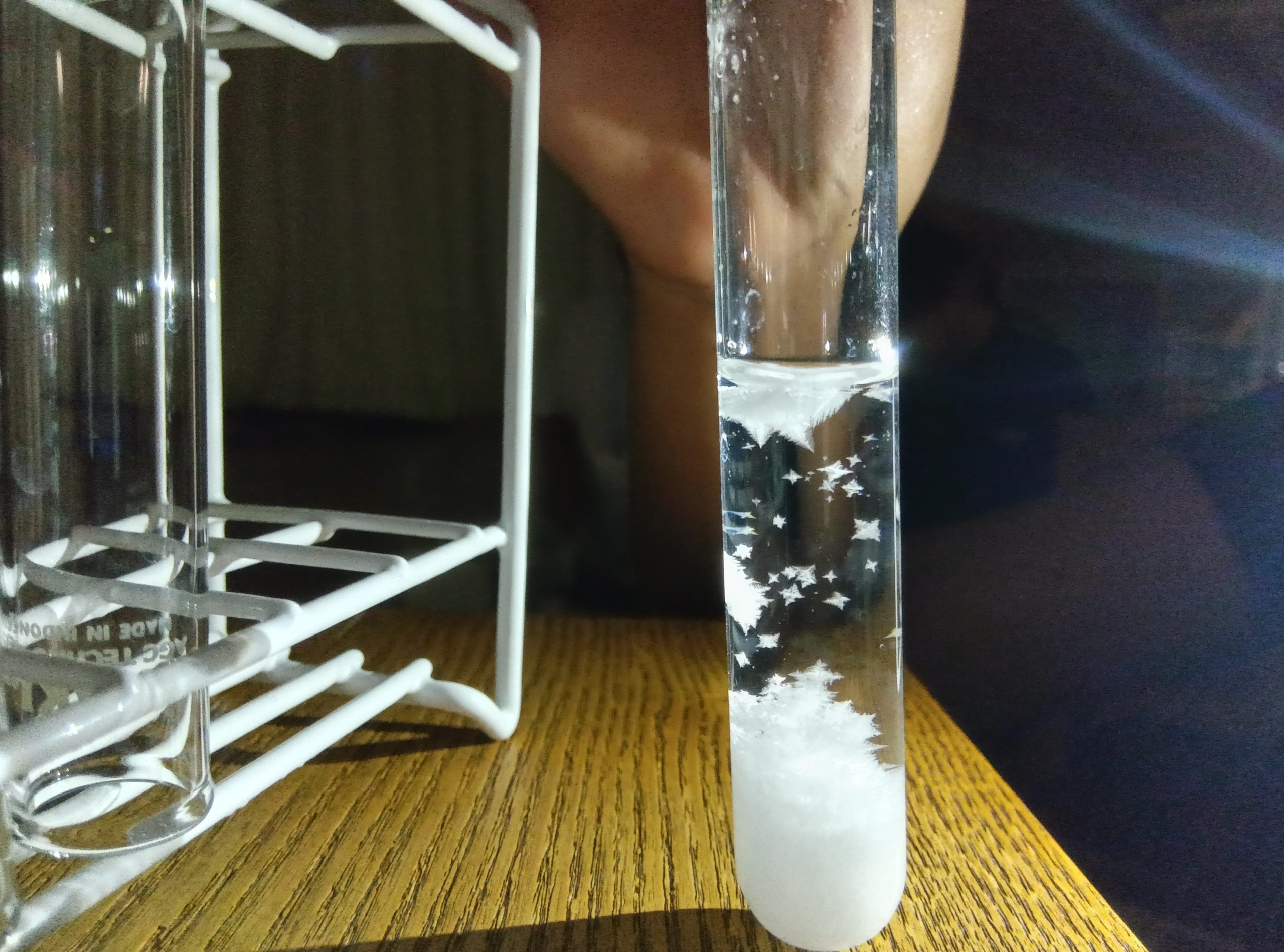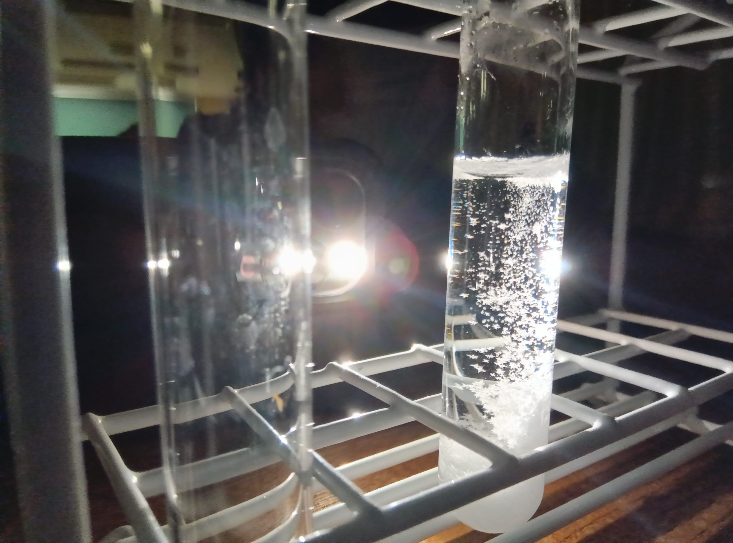 りかの じかんに、しけんかんの なかで ゆきを ふらせました。しけんかんに みずを いれ、えんかあんもにうむを ゆせんで とかします。5ふん まつと、すいようえきの なかに とつぜん、ゆきの ような けっしょうが うまれ、どんどん ふりました。りかしつを くらくし、せいとは あかりを つけて、けっしょうが できる ふしぎな ようすを かんさつしました。