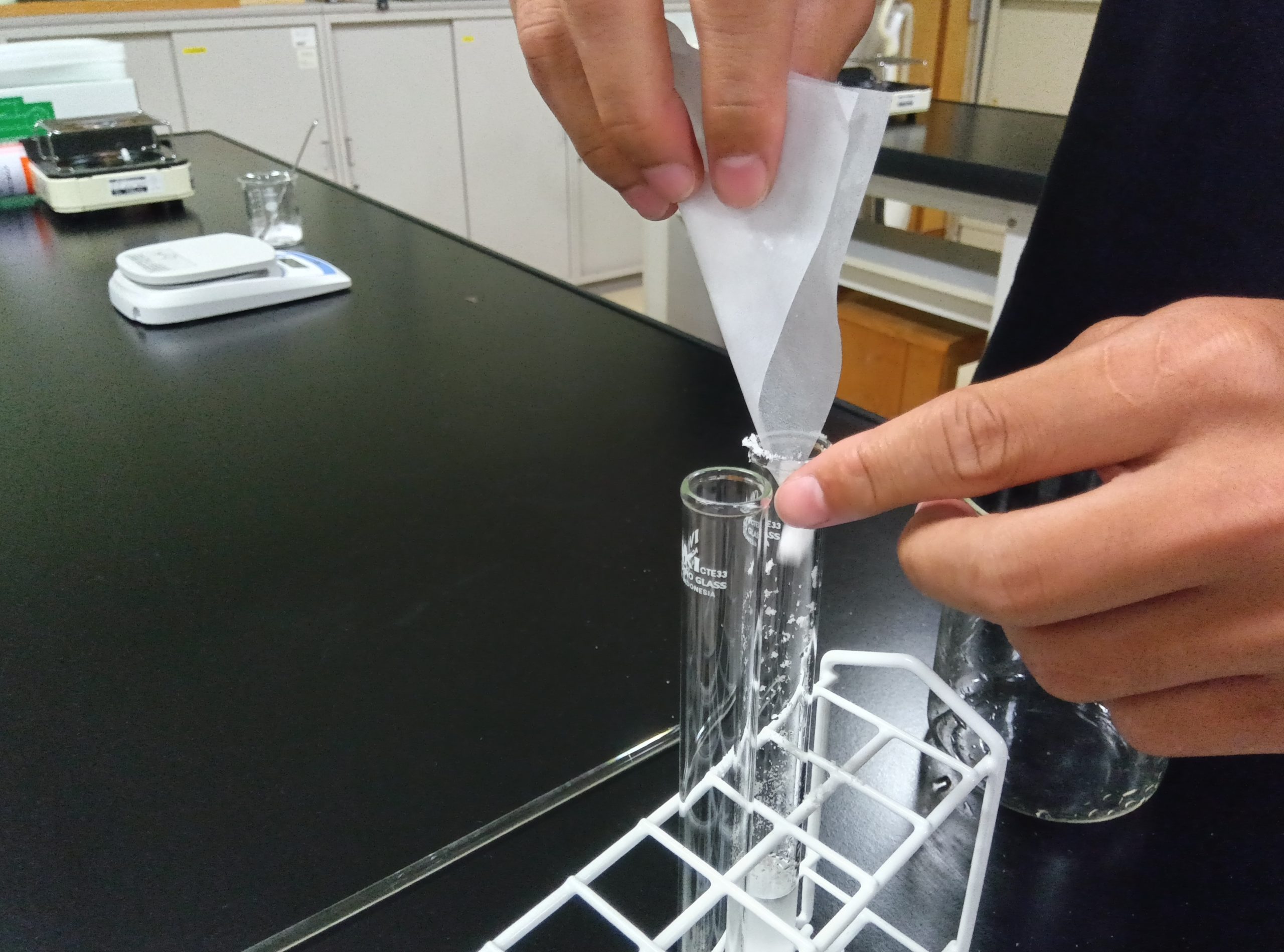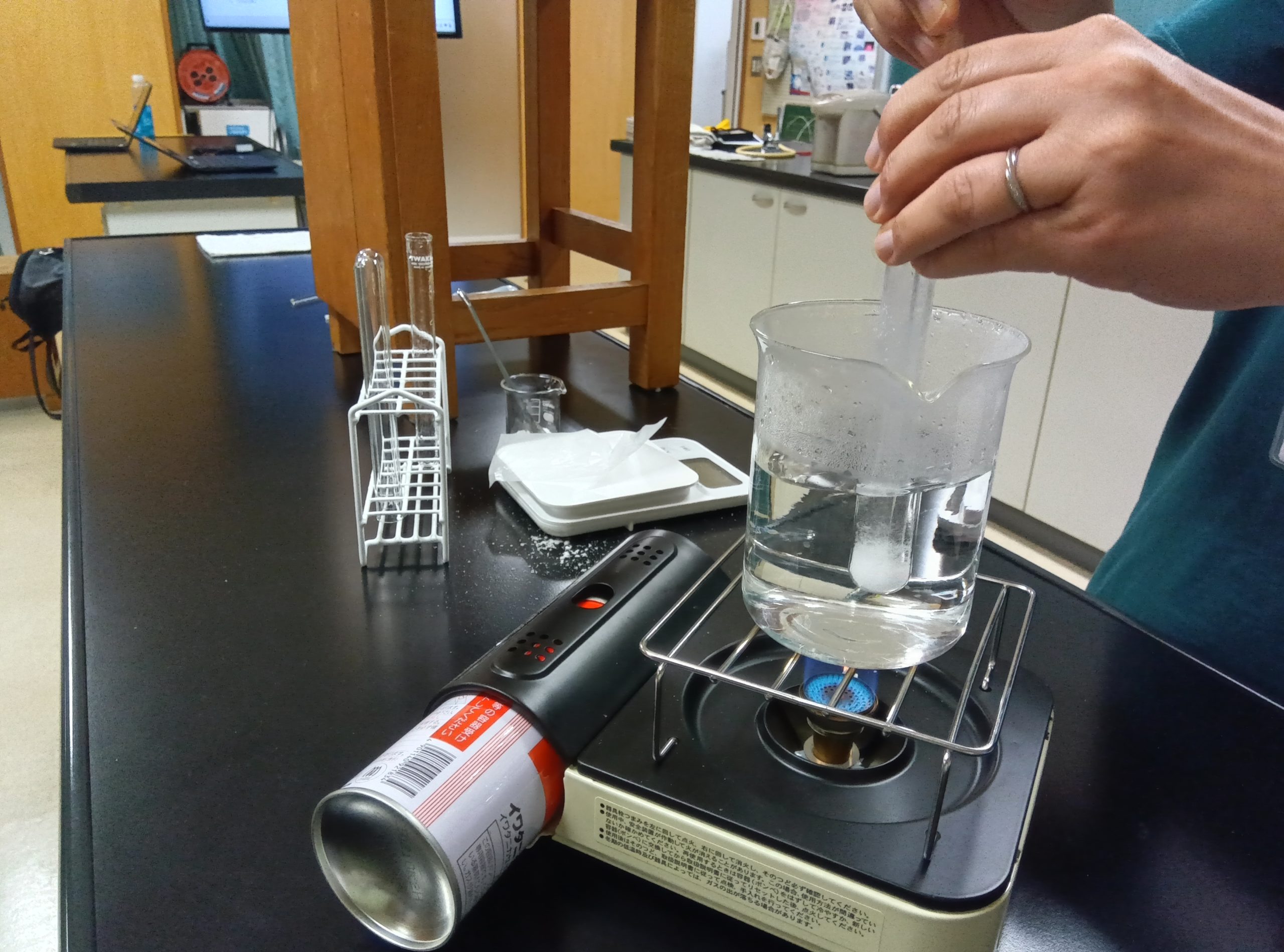 理科の時間に、試験管の中で雪を降らせました。試験管に水を入れ、塩化アンモニウムを湯煎で溶かします。5分待つと、水溶液の中に突然、雪のような結晶が生まれ、どんどん降りました。理科室を暗くし、生徒は明かりをつけて、結晶ができる不思議な様子を観察しました。